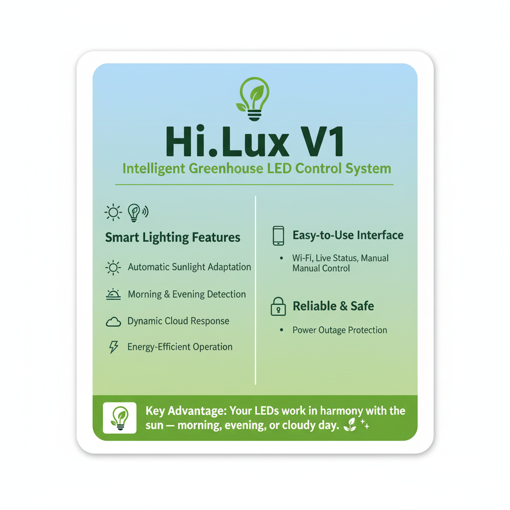 π‘ Key Advantage: Hi.Lux V1 turns any greenhouse into a smart, responsive ecosystem where your LEDs work in harmony with the sun β morning, evening, or cloudy day.